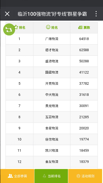 经过20多个日夜的投票,在参赛的1218家物流企业的竞争中,广缘物流不负众望,共得到64518票,位列第一名,这是更多客户对广缘的认可,是对广缘的信赖,是广缘诚信经营的回馈,是每一个广缘人的骄傲。